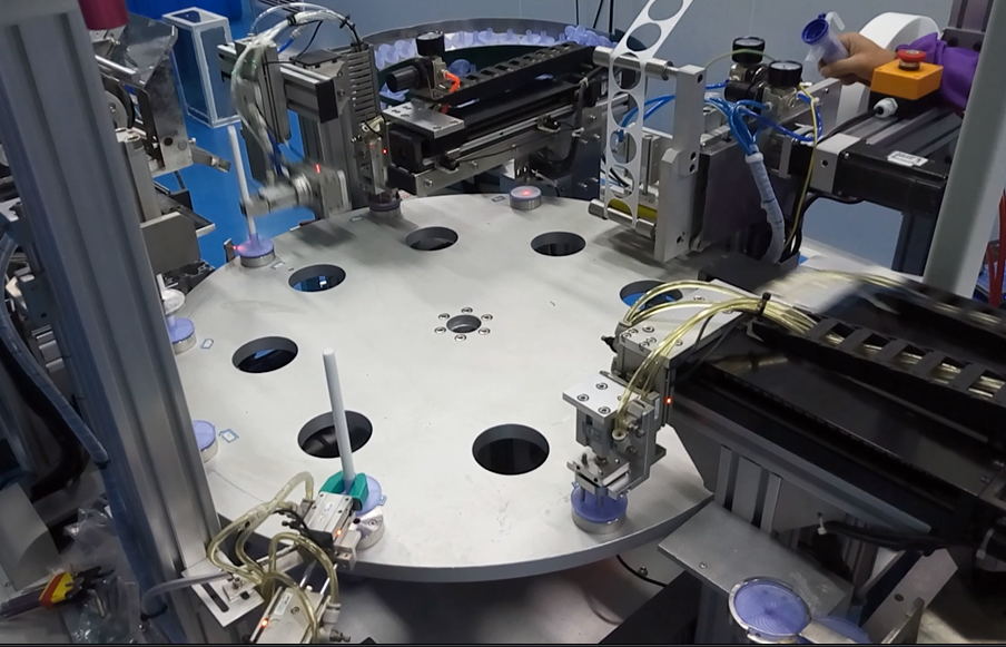其中分别应用了塑料件自动理序自动上料,在线模切上料,注塑件过盈扣合,及导水壳导水芯自动穿插。